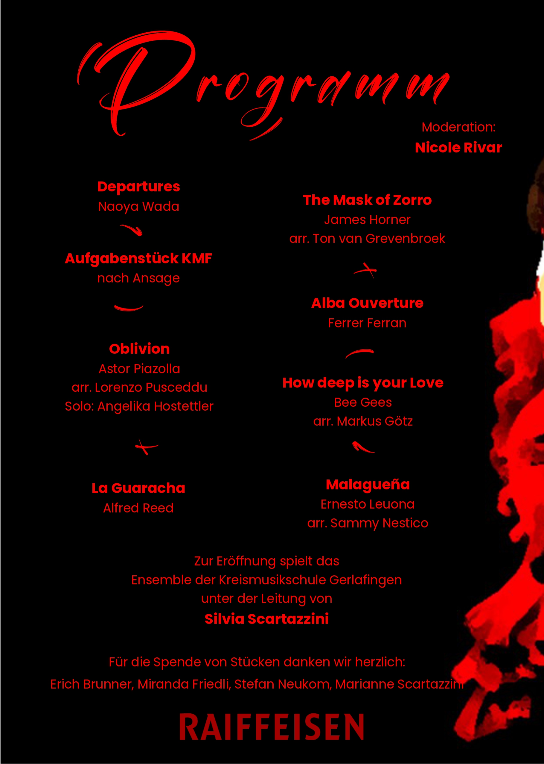 Eröffnet wird das Konzert vom Ensemble der Kreismusikschule Gerlafingen. Als Moderatorin führt Nicole Rivar durch den Abend. Ab 19 Uhr gibt’s Snacks, Drinks, Kaffee und Kuchen.